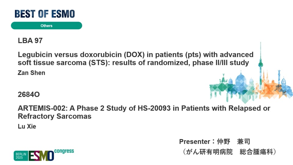 解説【LBA97】Legubicin versus doxorubicin (DOX) in patients (pts) with advanced soft tissue sarcoma (STS): Results of randomized, phase II/III study【2684O】ARTEMIS-002: A Phase 2 Study of HS-20093 in Patients with Relapsed or Refractory Sarcomas 仲野 兼司 (がん研究会有明病院)