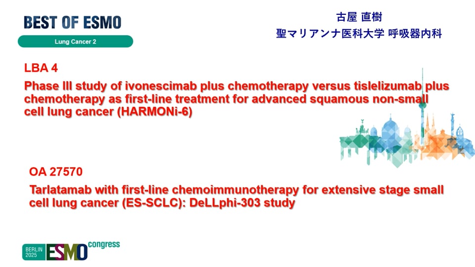 解説【LBA4】Phase III study of ivonescimab plus chemotherapy versus tislelizumab plus chemotherapy as firstlinetreatment for advanced squamous non-small cell lung cancer (HARMONi-6)【2757O】Tarlatamab with first-line chemoimmunotherapy for extensive stage small cell lung cancer (ESSCLC):DeLLphi-303 study 古屋 直樹 (聖マリアンナ医科大学)