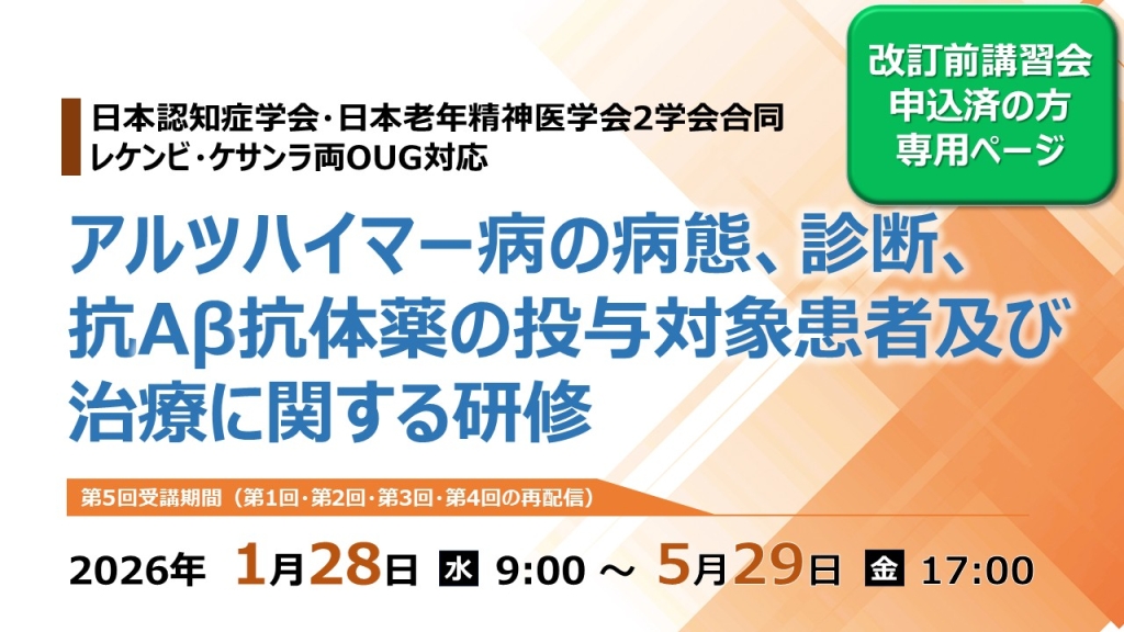 日本認知症学会・日本老年精神医学会は、今後、本講習の受講者を対象に、本講習や抗アミロイドβ抗体薬治療のついてのアンケート調査等を実施する可能性があります(回答は任意です)。調査等にあたっては、本講習の際にご登録いただいたメールアドレス・住所を使用させていただく場合がございますことをご了承ください。