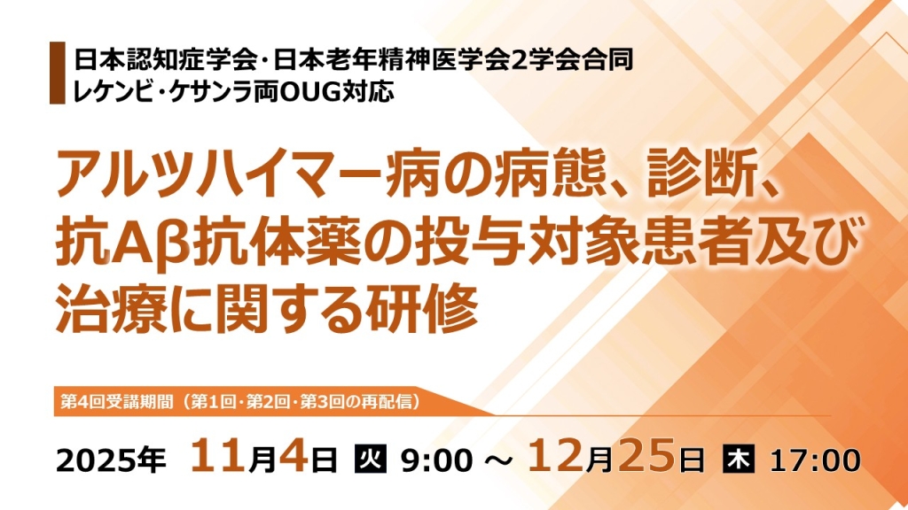 日本認知症学会・日本老年精神医学会では、アルツハイマー病治療薬(抗Aβ抗体薬)のレケンビおよびケサンラの上市を受け、その投与にあたり、投与医師に求められる基本知識を講義するweb研修を実施いたします。